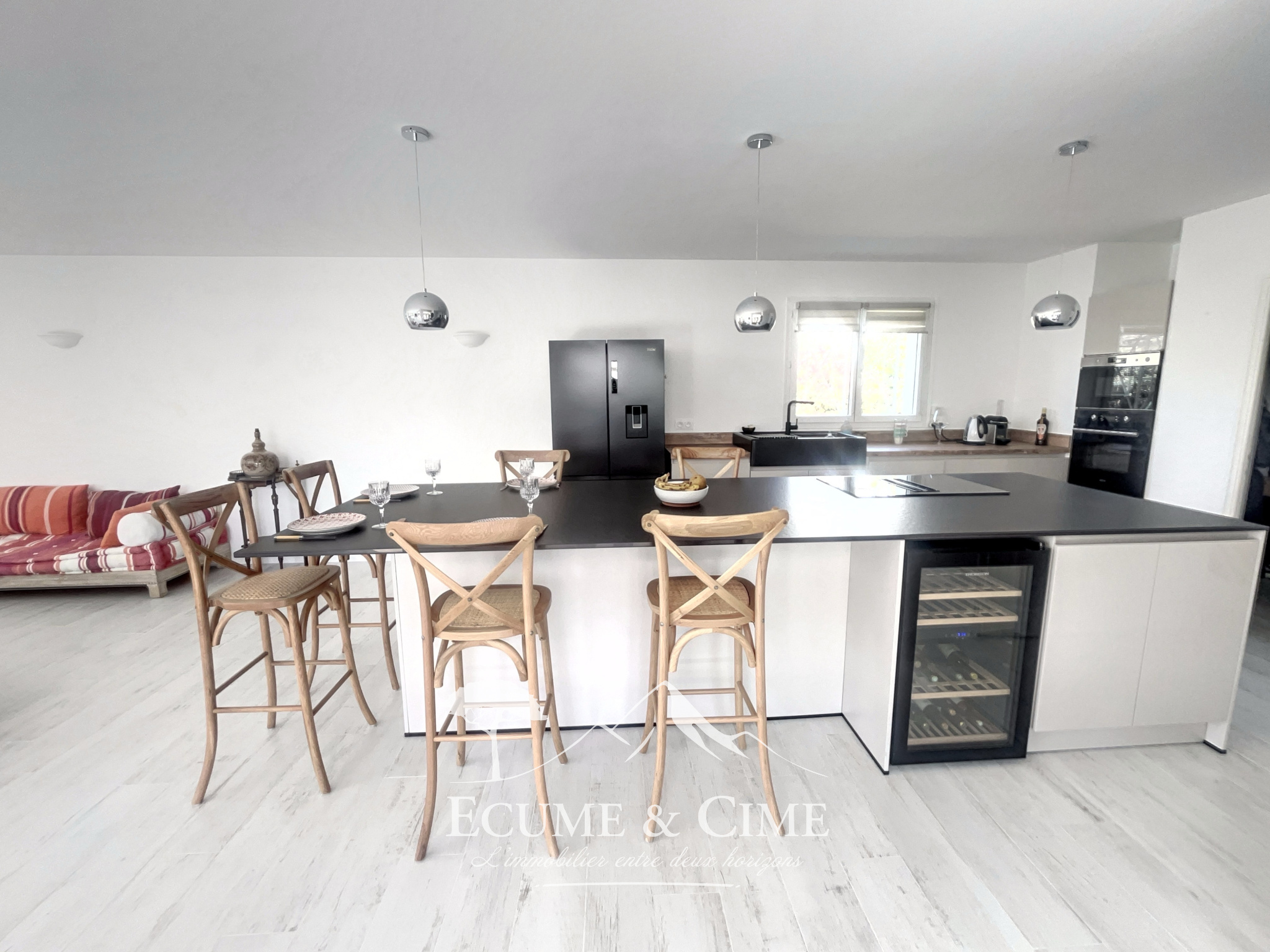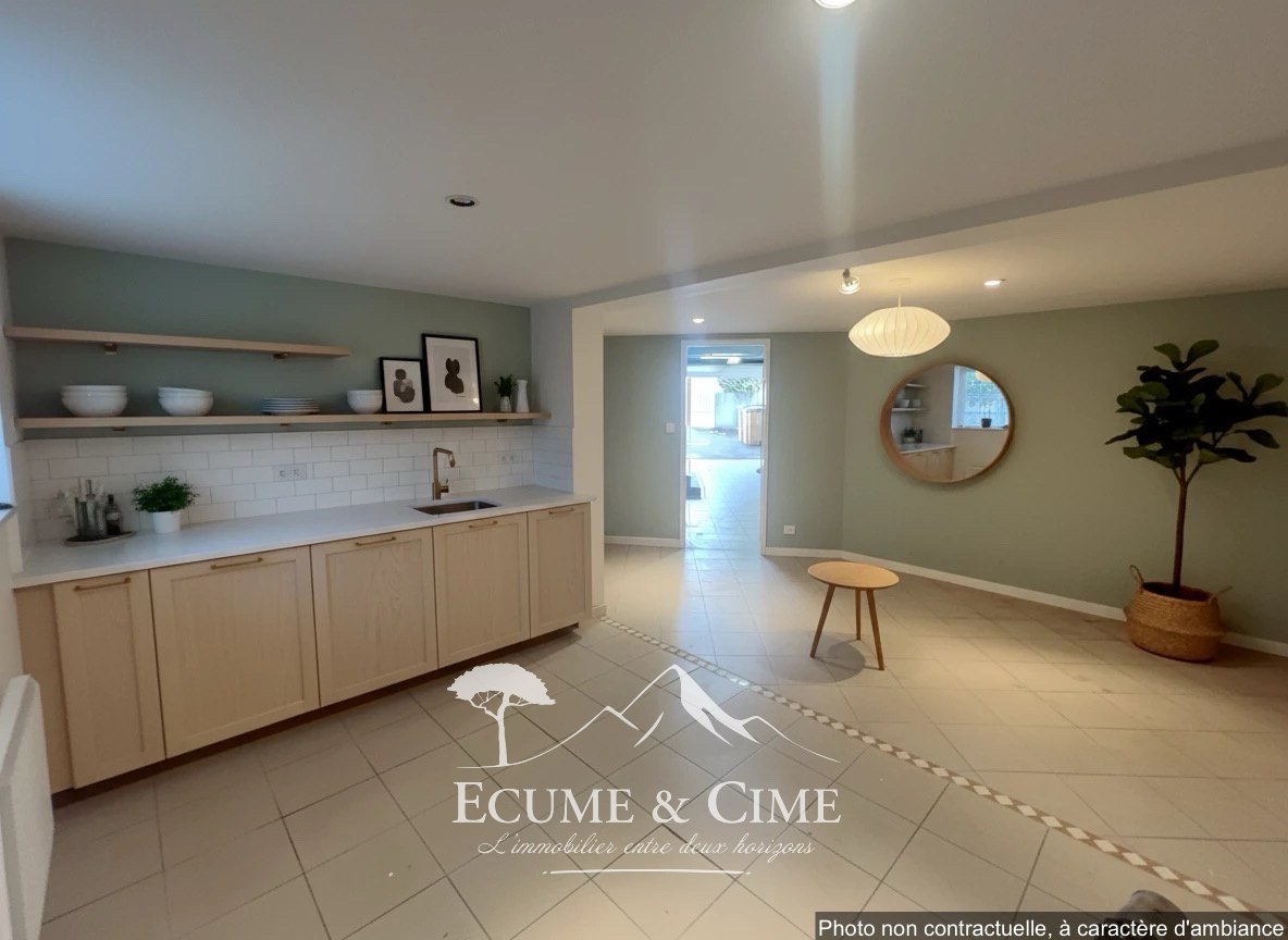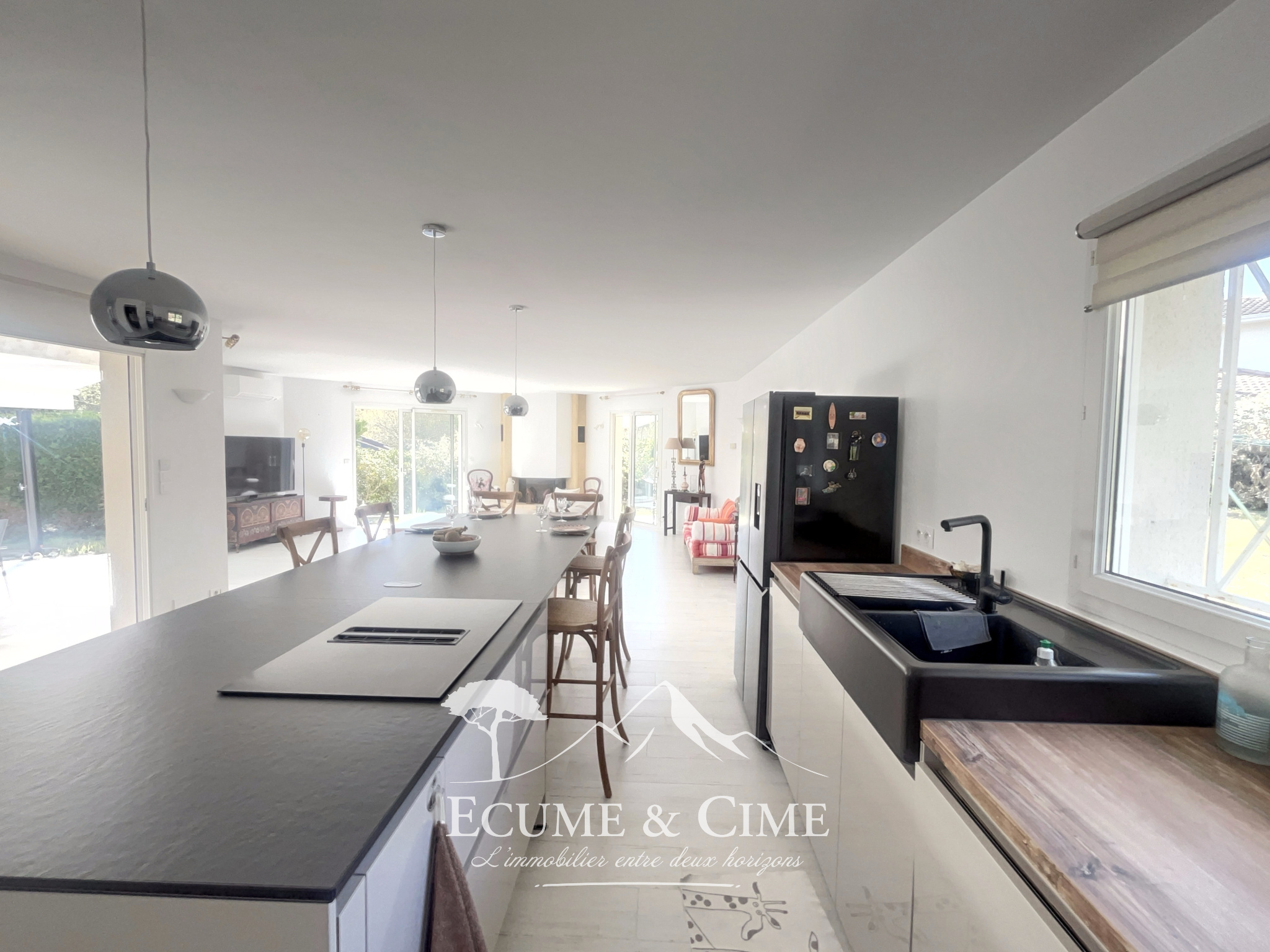 Baigné de lumière grâce a sa triple exposition, elle propose une belle pièce de vie conviviale avec cuisine américaine ouverte sur un séjour spacieux donnant directement sur la terrasse et le jardin.